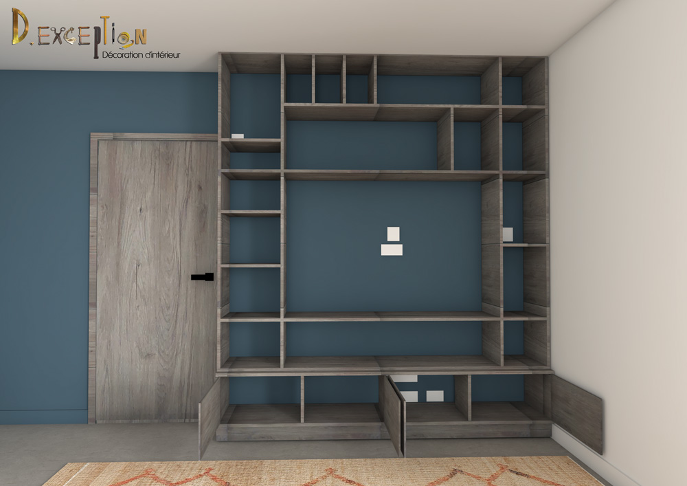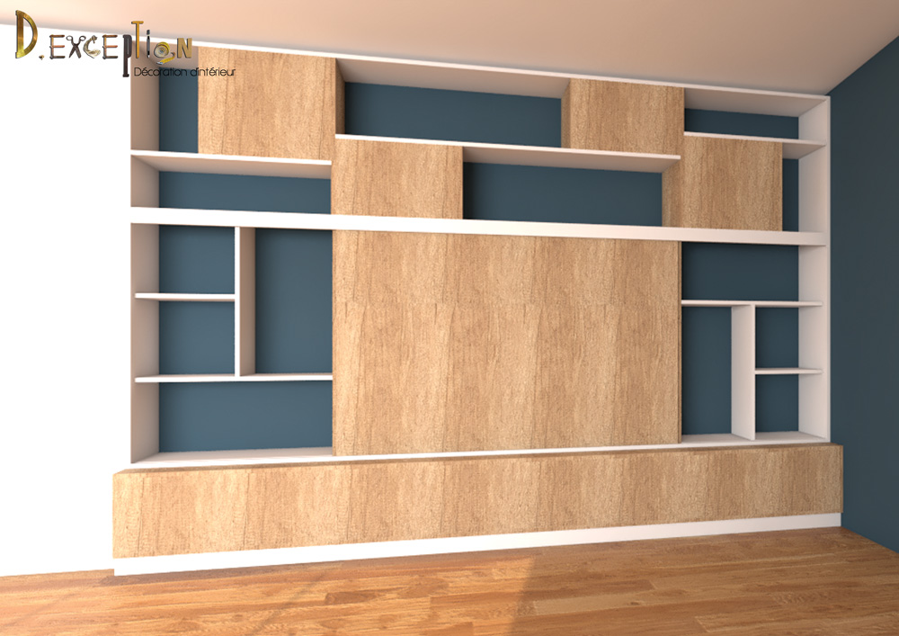 Sur le second projet présenté , j’ai voulu vous montrer justement à quel point j’essaie de coller au maximum à la réalité, en confrontant mon rendu photoréaliste à la photo du meuble tv-bibliothèque réalisé par le menuisier Frédéric Lacas de Lacas Agencement.