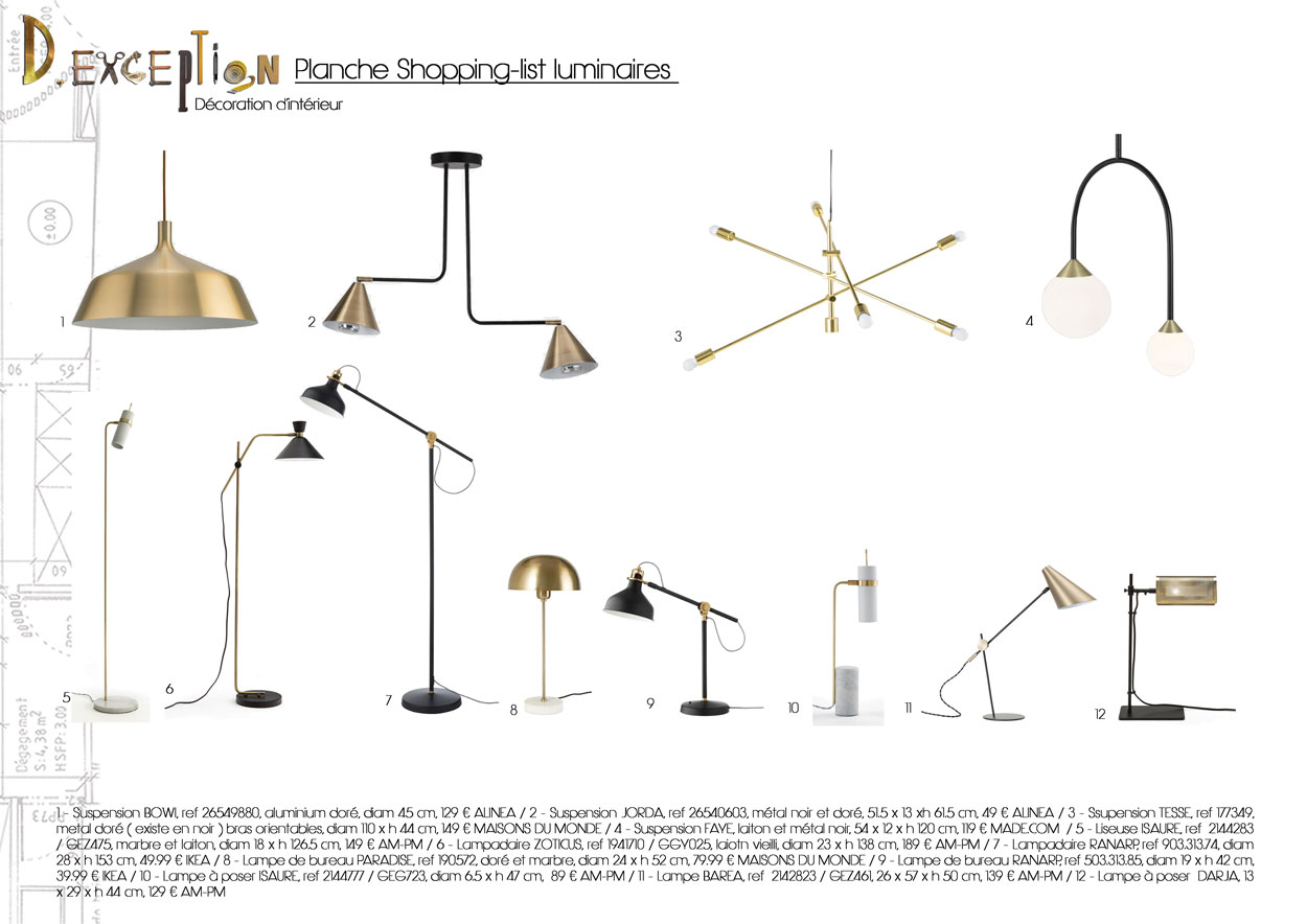 Je leur ai fait mes propositions sous forme de planche pour la recherche de canapé-convertible, fauteuils, tables basses. J’ai aussi listé les bureaux, fauteuils et rangements, soit proposés par des fournisseurs soit à chiner en brocante. Je leur ai également proposé des luminaires à suspendre ou à poser, ainsi que les accessoires textiles de type rideaux, tapis et coussins, qui rendent chaleureux une pièce.