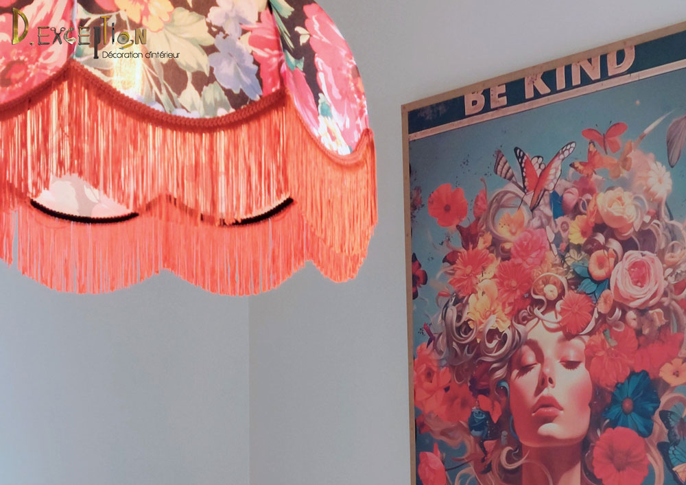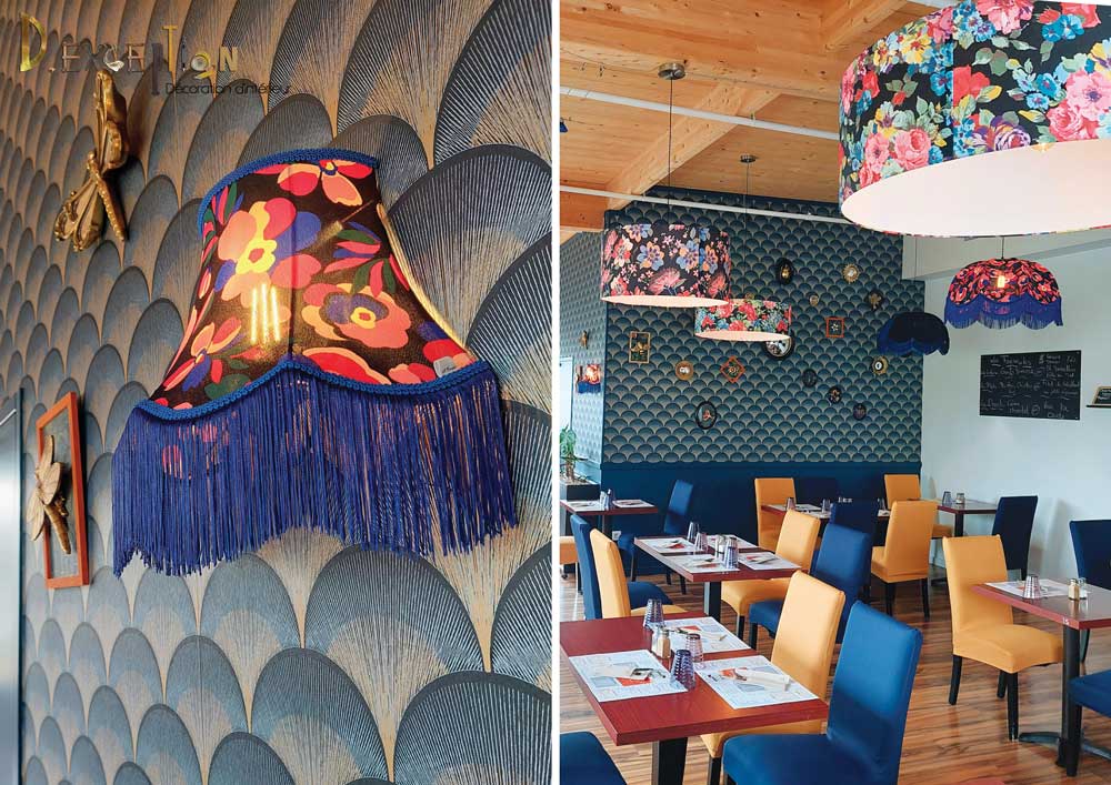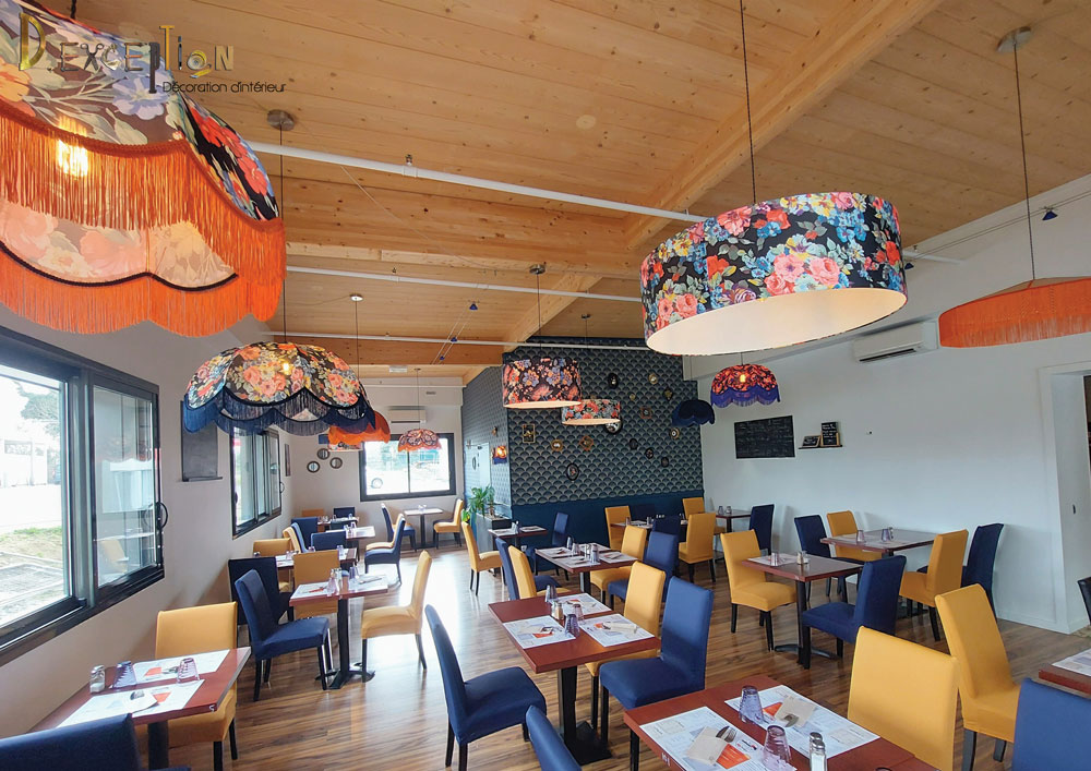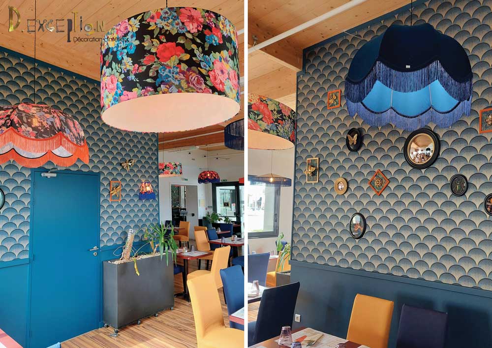 Les clients souhaitaient retrouver une touche un peu rétro au niveau des luminaires, et nous sommes très vite tombé d’accord pour faire appel au talent d‘abat-jouriste d’Aurélie Cousin. Elle a su me proposer des tissus toujours en lien avec la palette de couleurs de l’ambiance déco, et nous avons ainsi déterminé 18 abats , tous différents, jouant avec les formes, les tailles XXL, les motifs floraux et les belles franges pour un ensemble composé sur mesure et qui donne tout le caractère au lieu !