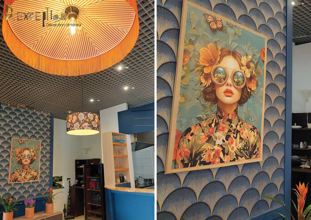 Quant Magali & Thierry m’ont contactée l’année dernière, les travaux du centre commercial où est situé leur restaurant venait de commencer. Ils souhaitaient profiter de cette période pour changer l’identité de leur restaurant, repris en 2024, et revoir entièrement la décoration intérieur, en y apportant une ambiance chaleureuse, colorée et plus en adéquation avec la cuisine proposée.