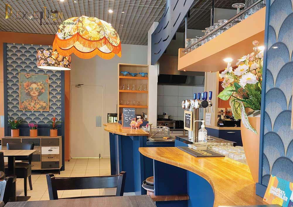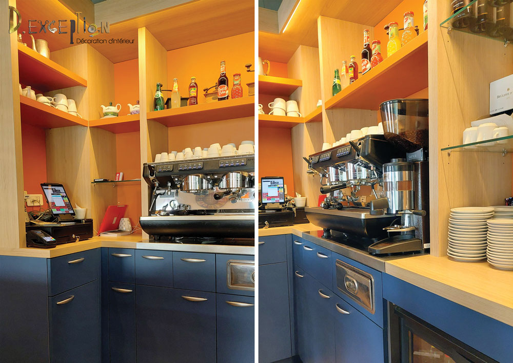 Côté bar, un gros travail de rénovation a été exécuté par les menuisiers Frédéric et Julien de Lacas Agencement, avec la reprise des meubles de l’arrière-bar, en placage stratifié Bleu Cosmique, Orange de Sienne et Chêne Vincenza que j’avais sélectionné chez Egger.
