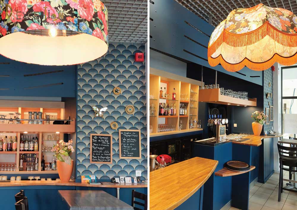 Bravo à Frédéric et Julien de Lacas Agencement pour le rénovation du bar, merci à Aurélie Cousin pour ses superbes abats-jours sur-mesure, et merci à Anthony de « Le monde des couleurs » pour la mise en peinture et la pose du papier peint.