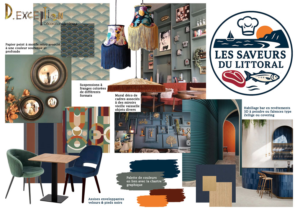 Mes clients se sont tout d’abord appropriés l’établissement le renommant « les saveurs du littoral »; ils ont crée un nouveau logo, dans les tons bleu et orange, et c’est à partir de là que j’ai pu établir ma ligne directrice.