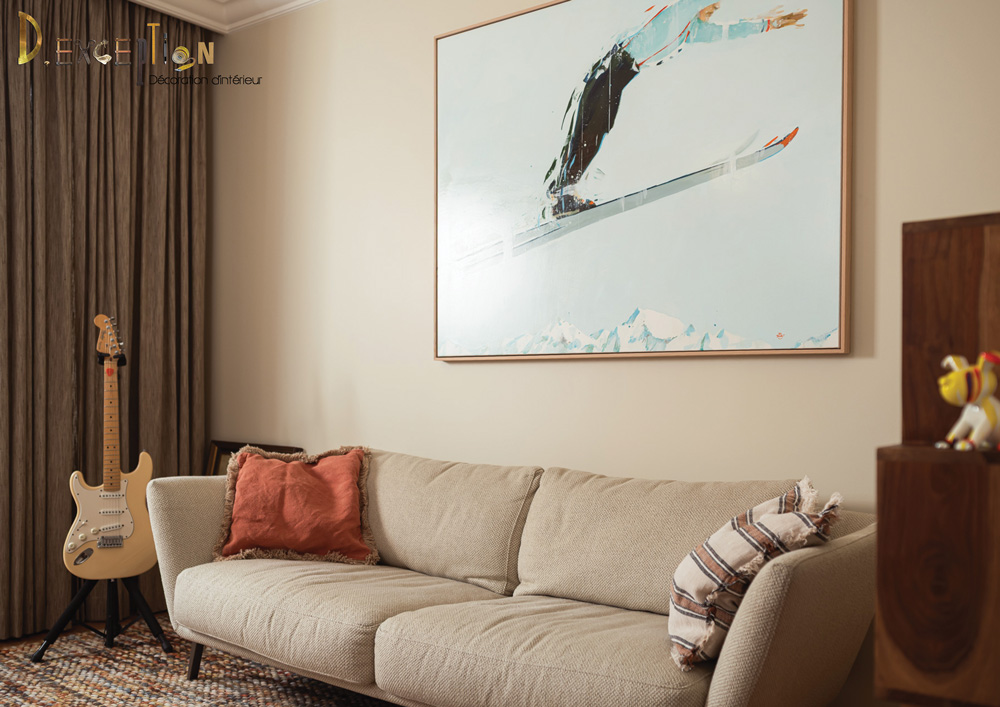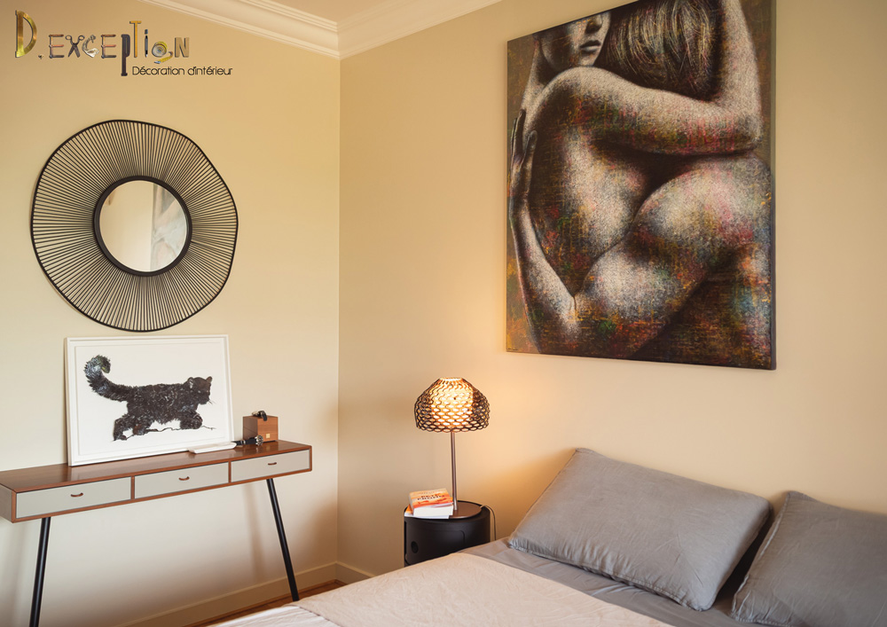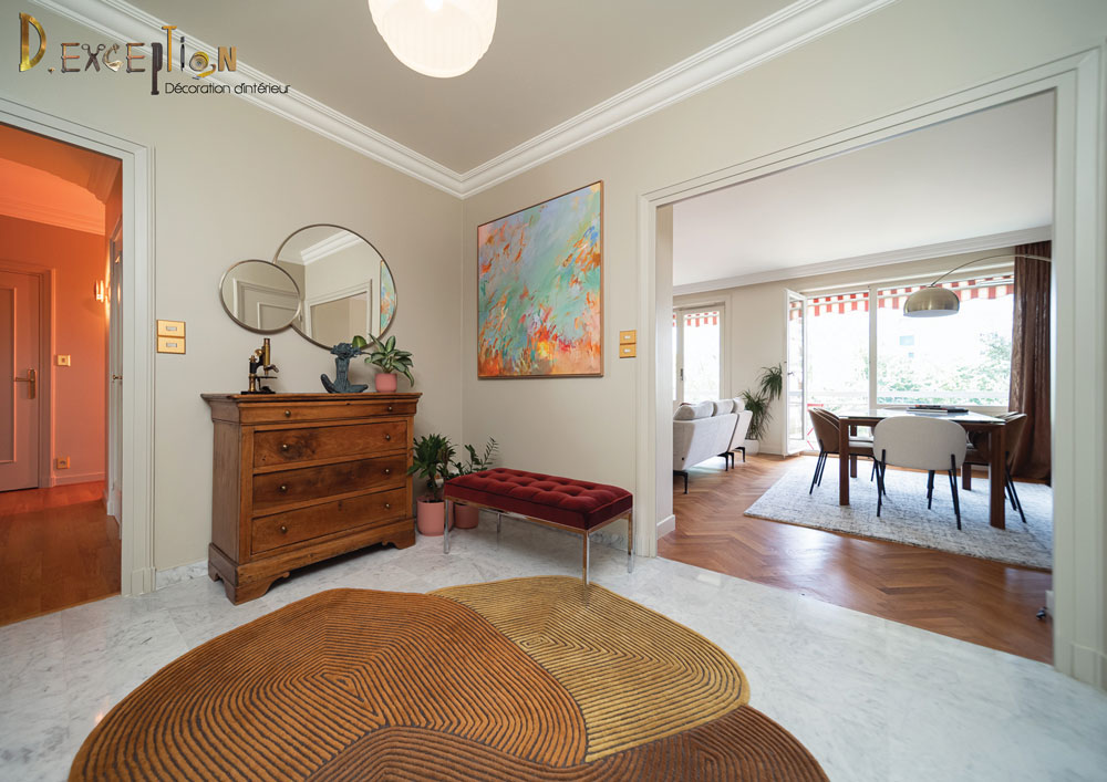 Pour ce projet, le client souhaitait compléter son mobilier avec une commode et une bonnetière style Louis XV. J’ai donc chiné ces deux éléments pour apporter une touche authentique à la décoration. L’association des peintures contemporaines accrochées aux murs avec ce mobilier de style apporte un effet chic et décalé qui donne toute sa personnalité à ce bel appartement.