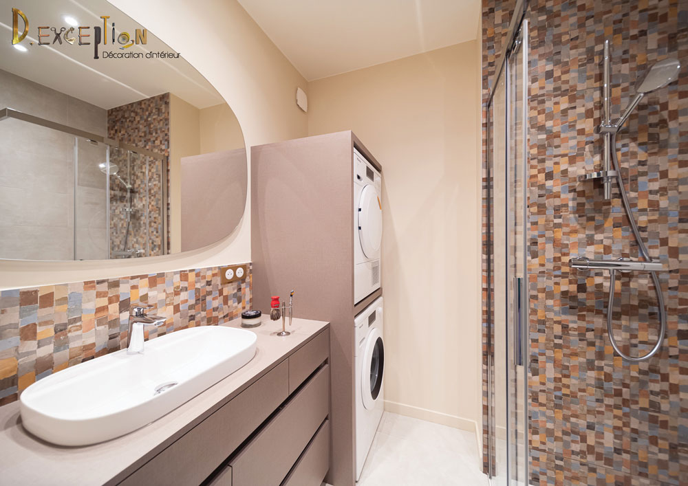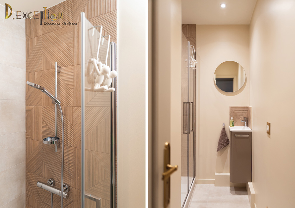 La salle de bain et la salle de douche ont été également retravaillées, autant dans leurs agencements que dans les choix des matériaux et équipements sanitaires. Pour la salle de bain, les murs de la douche et la crédence se sont parés d’un grès cérame à motifs abstraits multicolores de la gamme Pictura de Naxos, avec les carreaux de sol couleur sable assortis. Et pour la salle de douche, les carreaux effet bois graphique Tangram Colorker habillent la douche et la petite crédence au dessus du meuble lave-main d’angle.